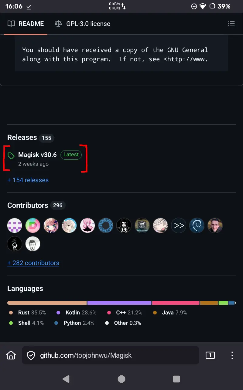 4. No tablet, instale o aplicativo do Magisk da fonte oficial no GitHub: https://github.com/topjohnwu/Magisk