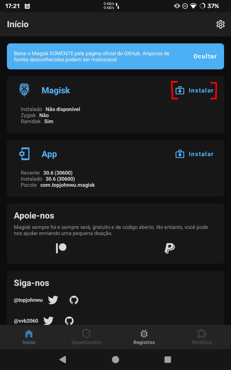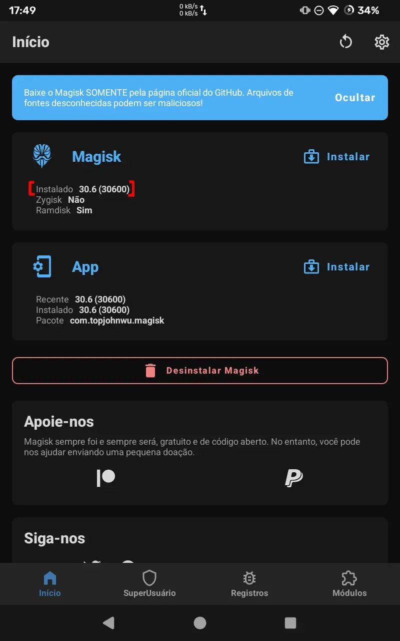 14. Ao abrir o aplicativo do Magisk, ele deve estar instalado.