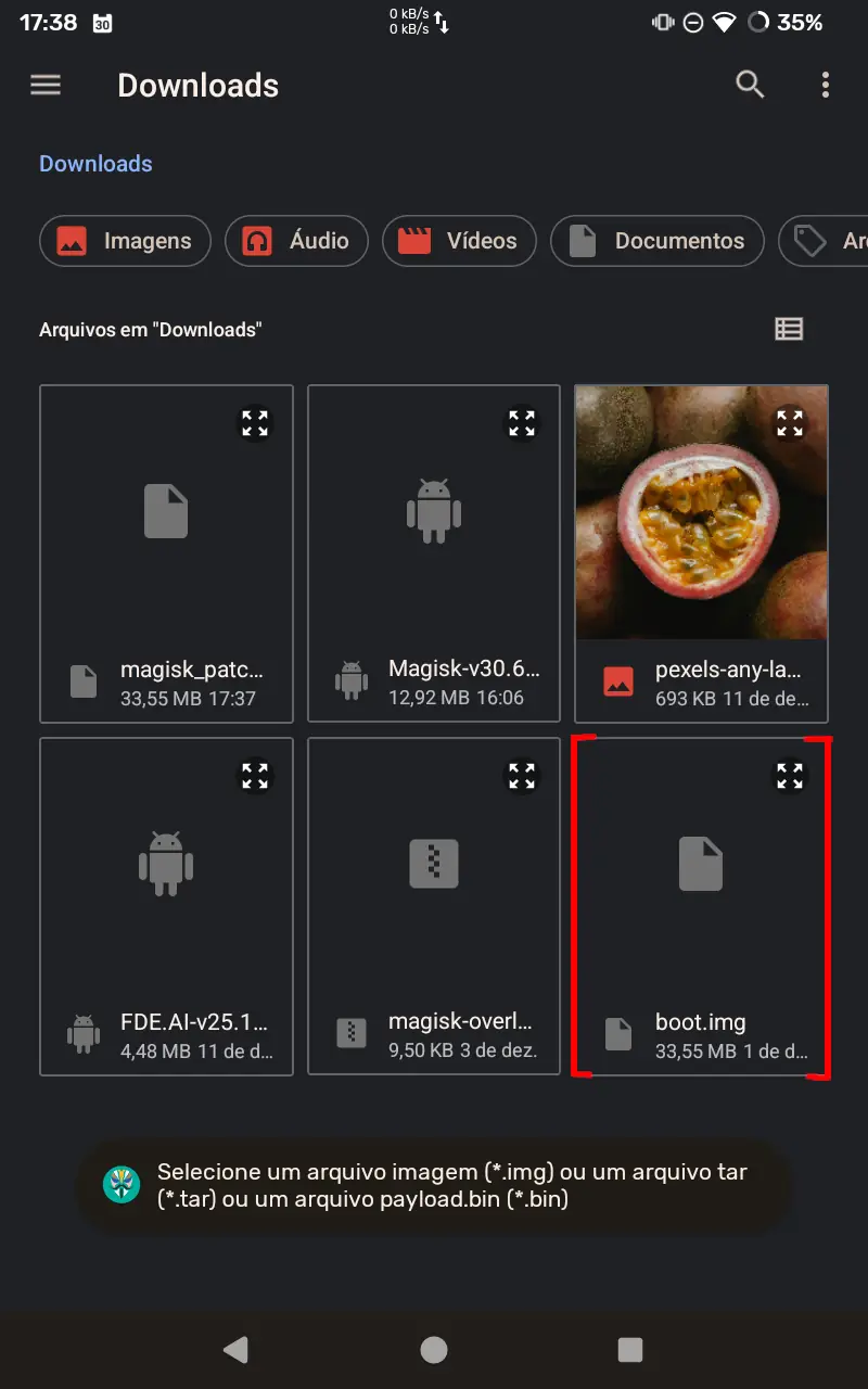 7. Localize no seu tablet e selecione o arquivo de imagem "boot.img", que havia sido copiado do computador.
