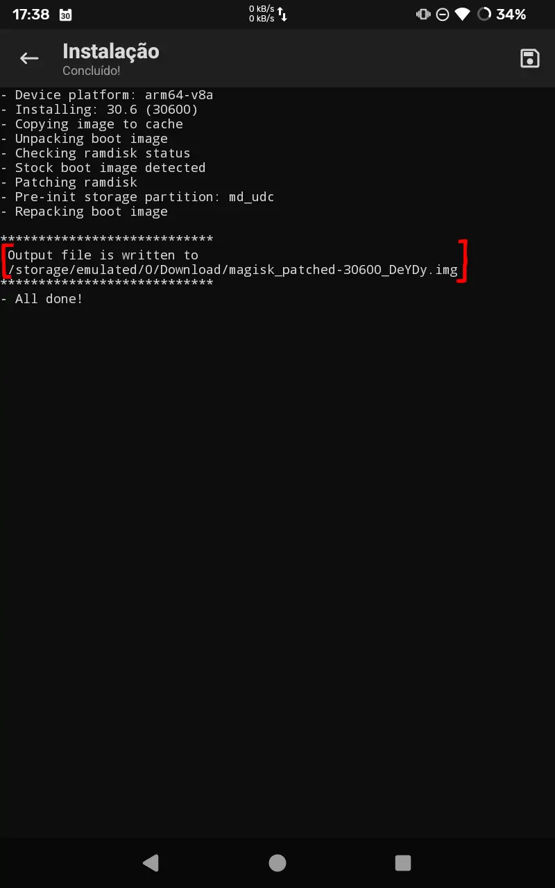8. O aplicativo do Magisk irá fazer o arquivo de imagem de boot modificado.
